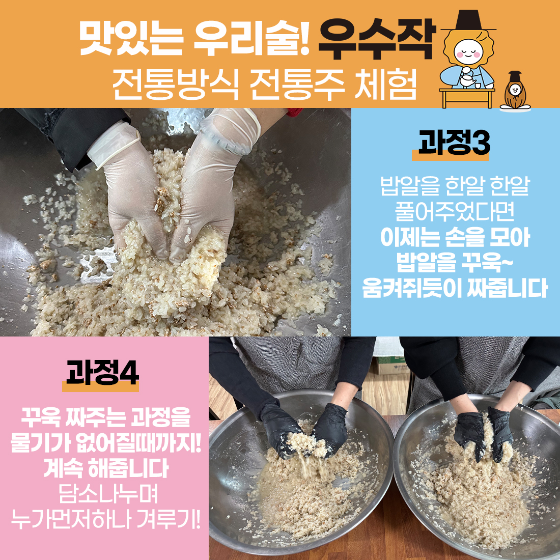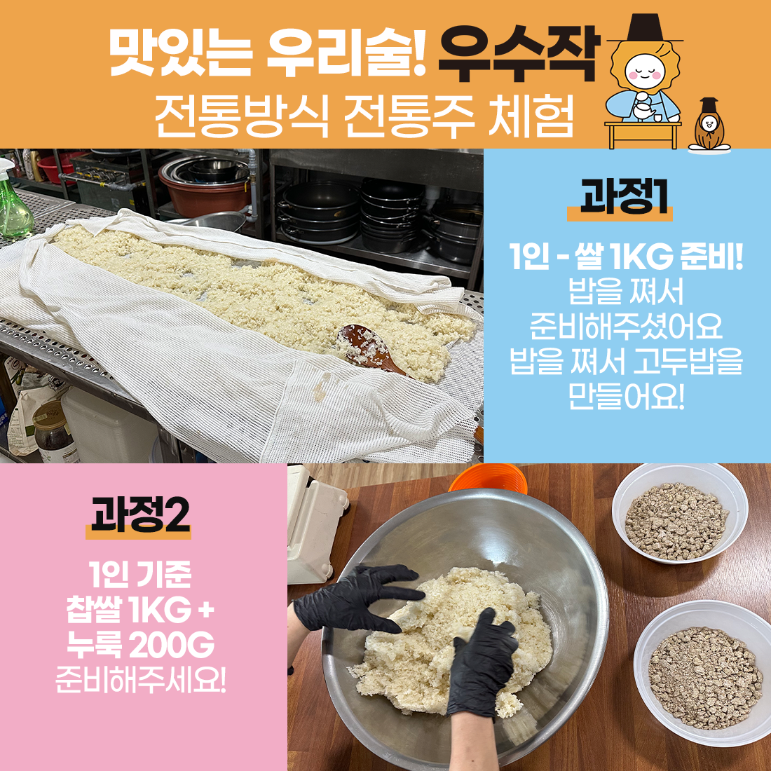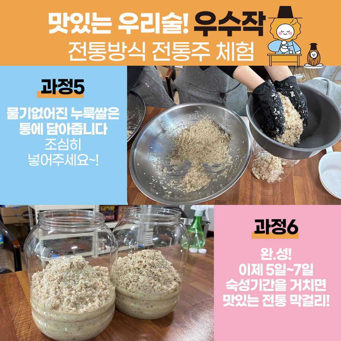 ※체험 당일에 필요한 막걸리를 저희가 직접 빚어, 채주 과정과 함께 시음회를 하고 있습니다. 전통주 체험 예약시, 원하시는 날짜 일주일 전에 문의바랍니다~